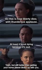 Aug 06, 2019 · by s. In star wars, episode iii, senator padme amidala utters "so this is how liberty dies, with thunderous applause," as the intergalactic senate votes unlimited powers to the chief executive and it turns out really, really badly. So true is it today! But several other people have pointed out the discrepancy. In fact, if you are paying attention, you might realize we are living that moment.